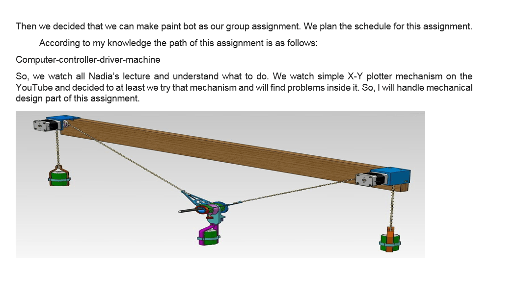 In this week we design a paint/wall bot mechanism.Which is paint verticle wall.In this assignment, we are three working members.We distrubuted work by specific branches like I am good in mechanical design so I use to my efforts on part design and other one will take electronic parts.Its like group study when they have any design problems then I am the person who clear out, and when I found any difficulty in electronics then they will help me.Actually this coordination is important during team work.It really feels like power of unity.Its good experience for me.!!