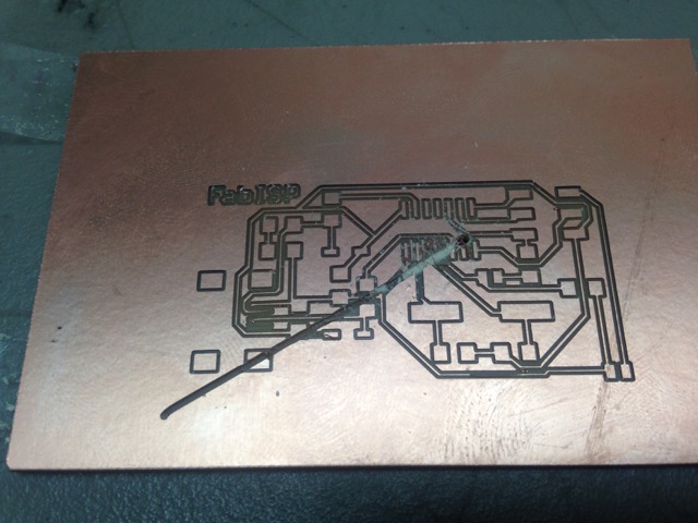 While troubleshooting the MDX-20 at South End Technology Center, I met Ed Baafi who was in the lab to use the laser cutter. He asked me what I was doing. I had a stack of two FR-1 3” x 2” boards, one of which was sacrificial. I explained to him my process and progress. Ed took the two PCB’s off the Modela and then pointed out that I had layered double stick tape to the bottom. This was the cause of my leveling problems. When milling out the board, I had to account for an extra layer of tape which was roughly the thickness of what I was attempting to mill out. The result was a board that was milled too deeply in certain areas; yet not enough to not at all in other areas.