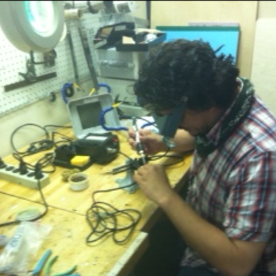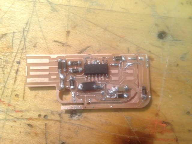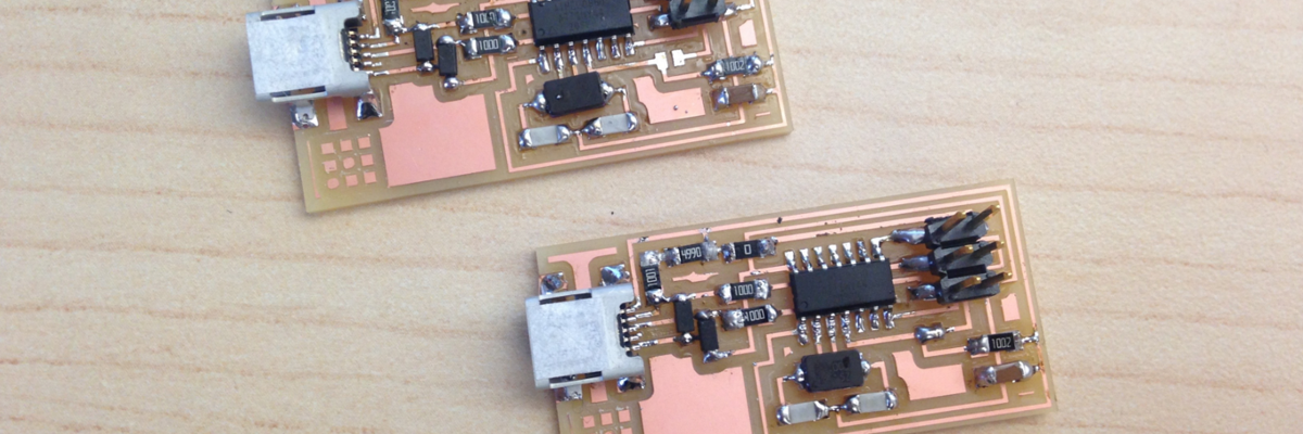 At FAB@CIC, I sat down with Luciano and Andrea Lane to mill out and solder the FAB ISP. Luciano and Andrea were both preparing electronics workshops for the week, and I thought it best to co-opt their experience. The first couple of iterations for me turned out poorly. The USB connections were off the traces on my first board. We did not have a heat gun at FAB@CIC. So, we attempted to desolder with the iron. Some of the traces were removed during that process. Luciano attempted to guide me through a fix by using a piece of copper braid to make the connection. After a couple of attempts, we resolved to remake the board. My second attempt was somewhat successful. All the connections were correct. In fact, we were able to get a green light from the AVRISP mkII indicating that the board was functioning properly. This turned out to be a fluke as we weren’t able to get a green light upon reconnecting the board to the programmer whether or not we used a different computer. Upon closer inspection, Luciano found that my components were a bit burned. His tip was to adjust my soldering technique. I tended to hover over spots while soldering. His tip was to find the hot end of the iron, lay on the pad for a second, then push a good glob of solder to make the joint. Once the solder melted, Luciano lifted the iron and blew to cool the joint. It was a quicker process that required less precision than I expected. We also used a piece of cardboard stuck to the table and mounted the board to the cardboard with double stick tape.