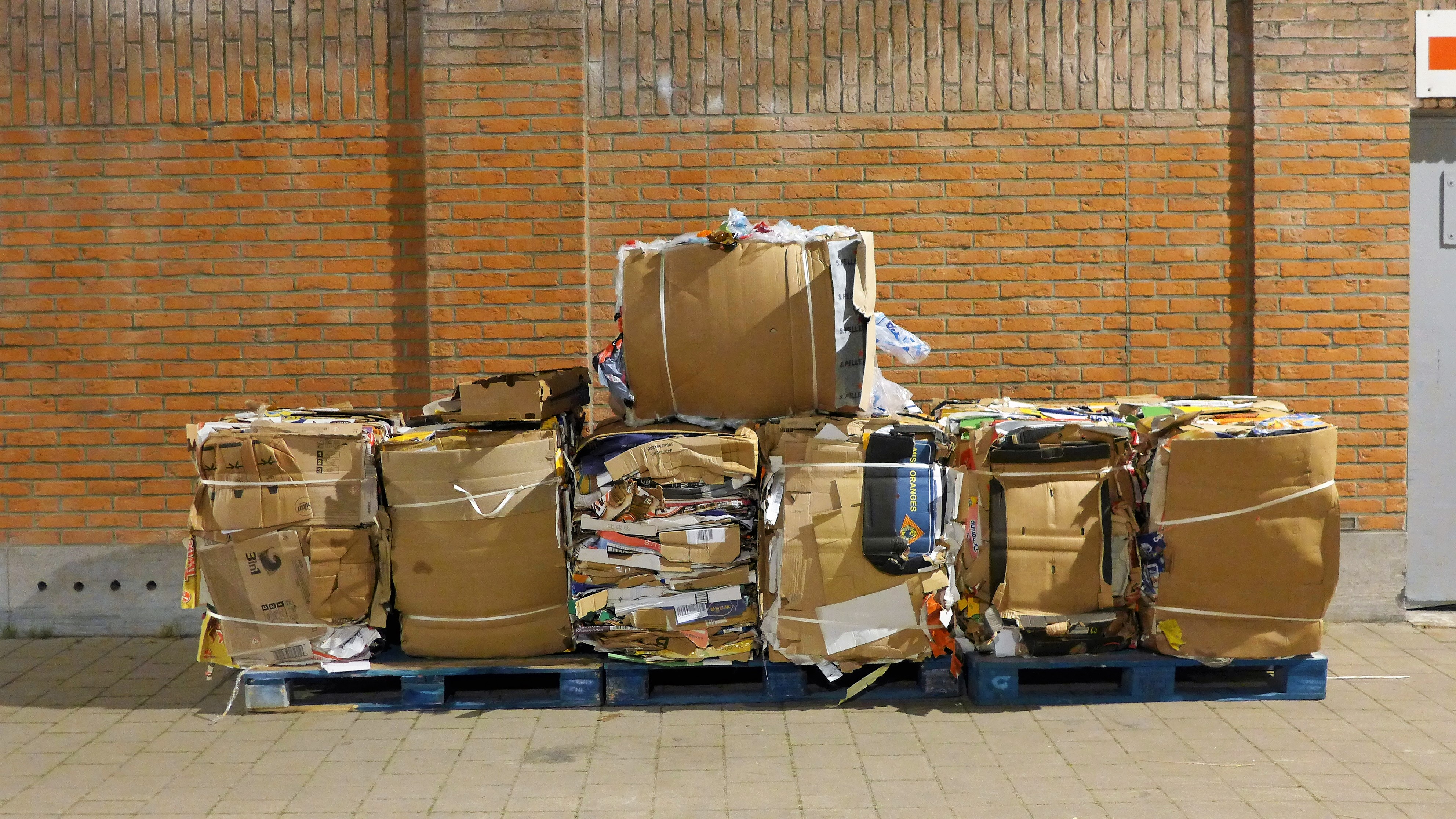 in compressed cardboard that you find outside the supermarket,compressed with a metalic sheet.