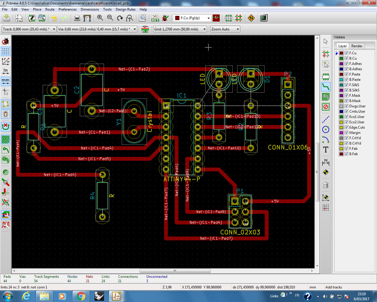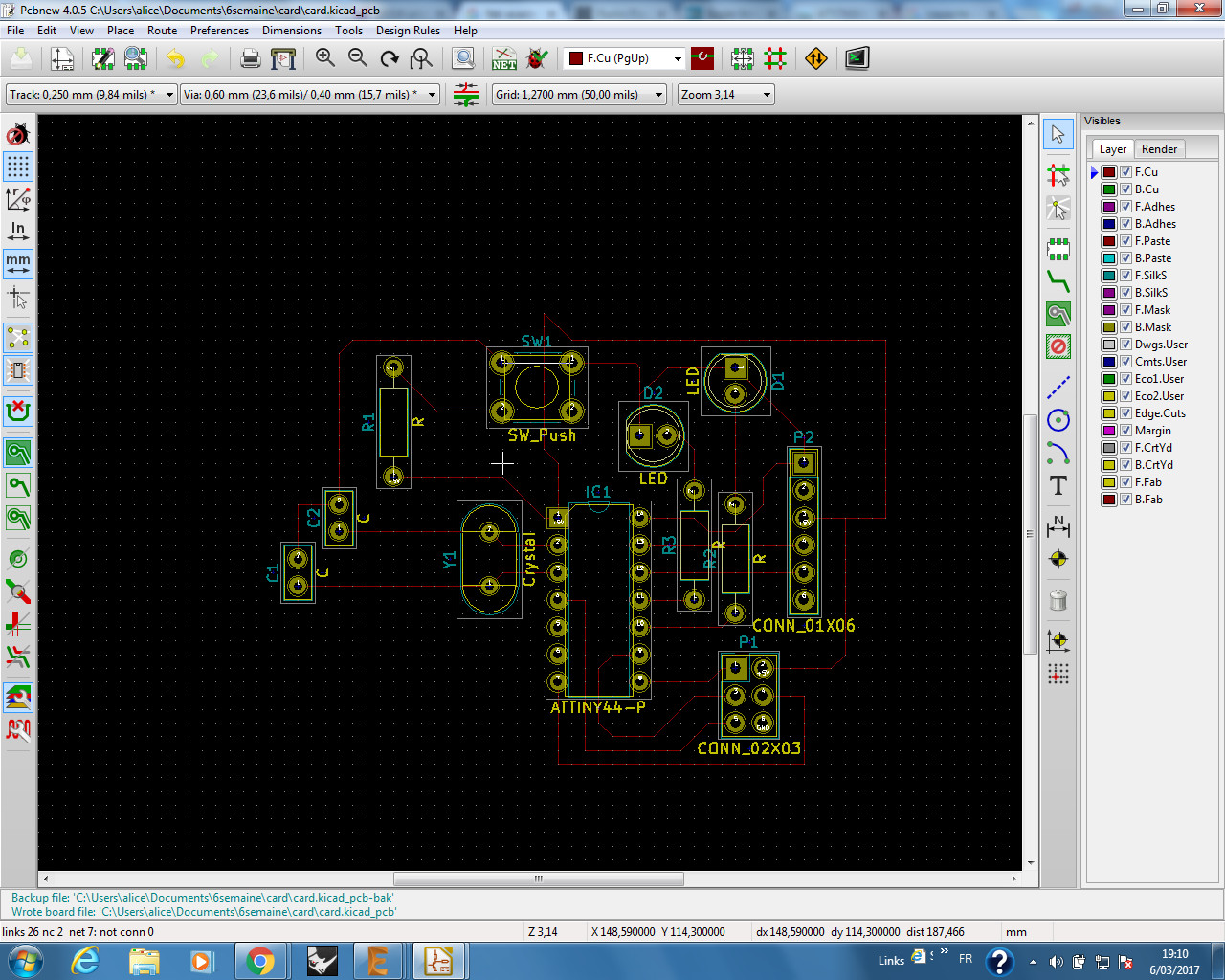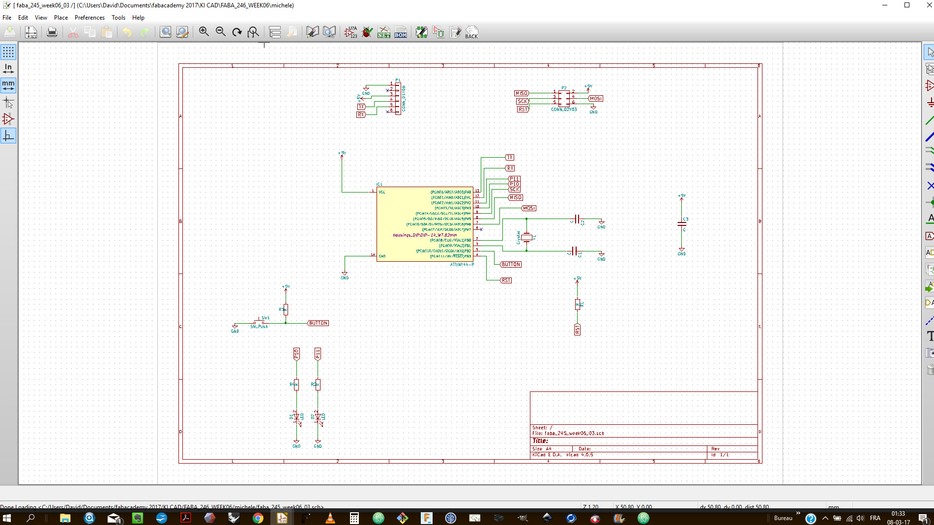 Redraw the echo hello-world board, add (at least) a button and LED (with current-limiting resistor), check the design rules, and make it