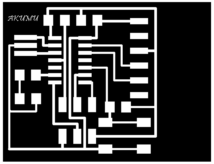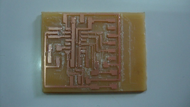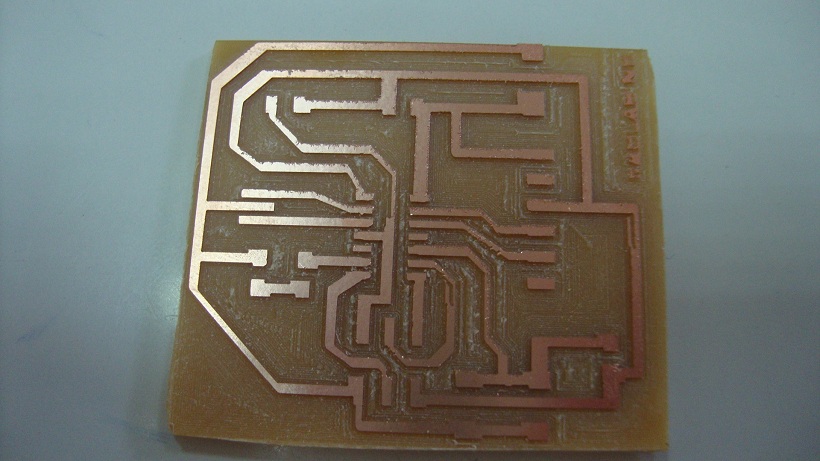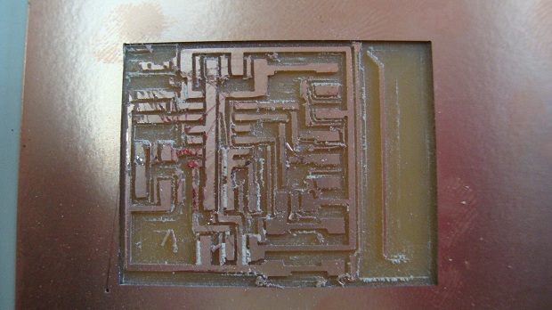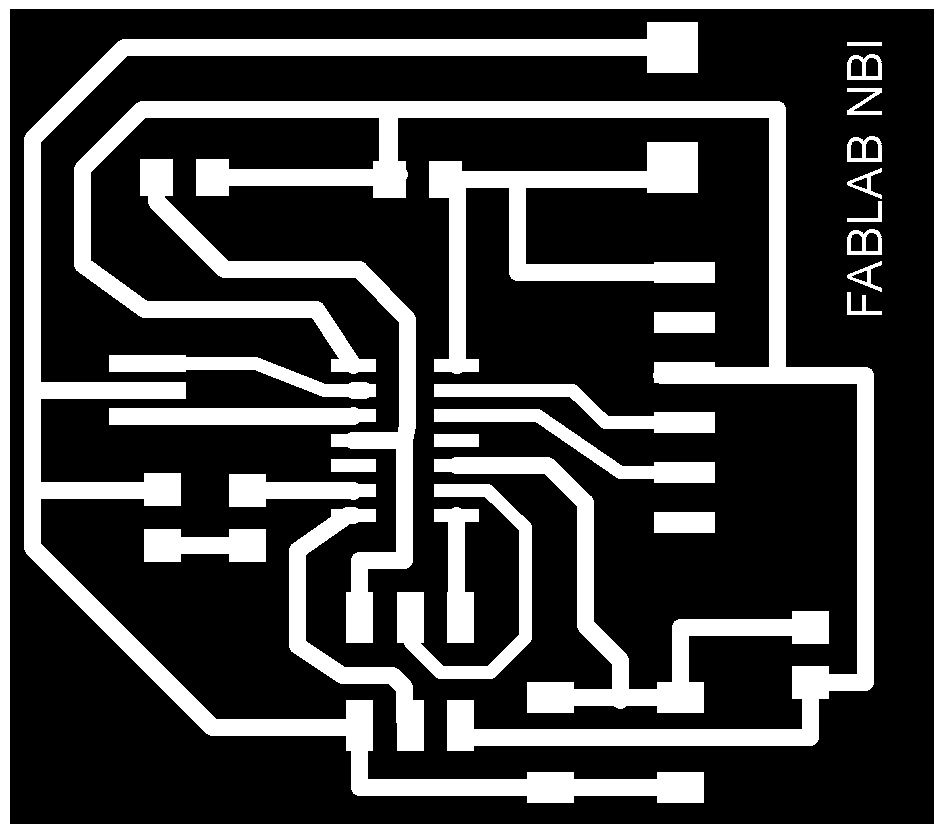 After routing all the traces, I exported the board design in monochrome and 500DPI, to be used with the Modela. I did some minor editing using GIMP.