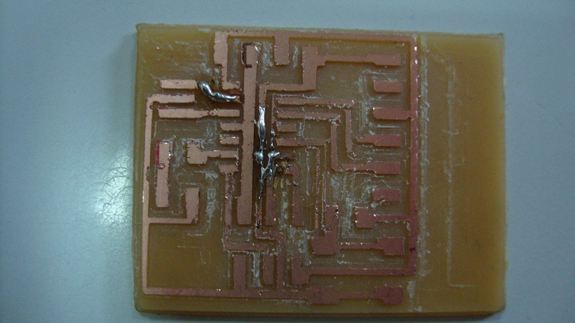 This first board did not mill properly. Some of the traces were completely milled off. Maybe I did not set the Z height of the end mill properly. Or maybe the Modela was shaking too much as a result of people walking around the Modela while it was milling. I will mill another board.