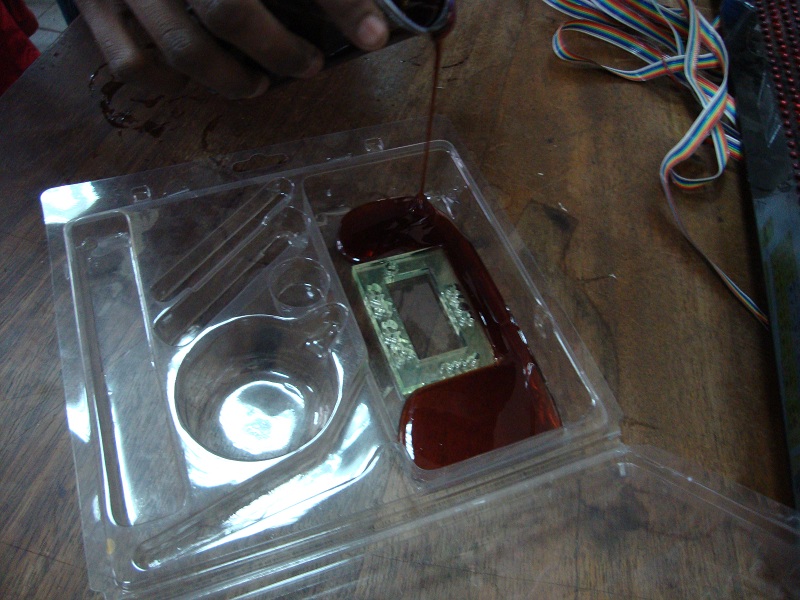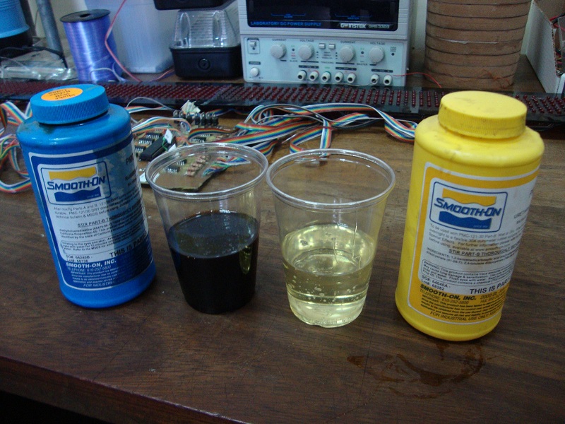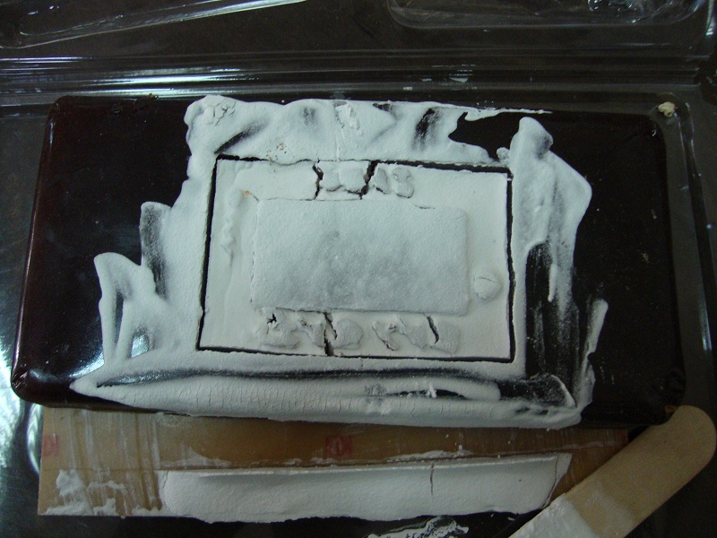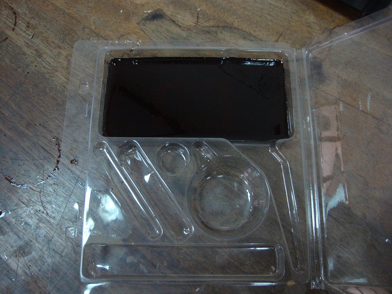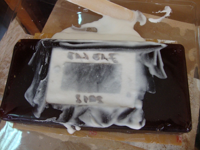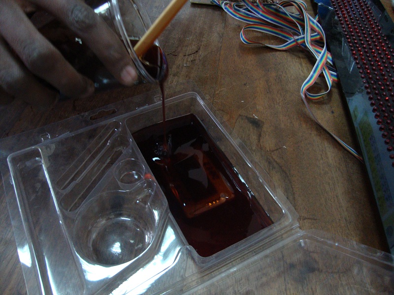 I placed the prototype model in a container with a flat surface. After patiently mixing and stirring the above mentioned chemicals, for consistency, and to remove air bubbles, I poured the mix over the acrylic prototype.