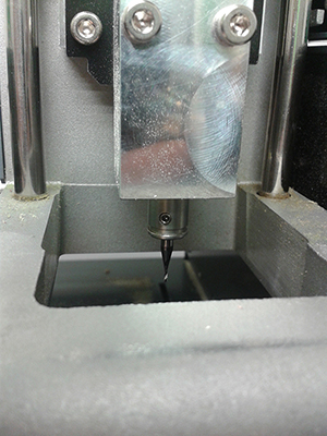 Next we’ll change the bit to suite our tool path. The Fab Lab stocks 3 different sized mill bits. a 0.01” (0.25 mm) bit for very fine traces, a 1/64” (0.4 mm) for regular traces and a 1/32” (0.79 mm) for cutting out the board and drilling any holes for vias or PHT components. Each bit should have its own tool path to avoid over use.
