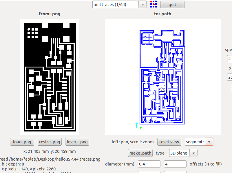 Generate the tool path by selecting the bit size you are using. Working from the smallest site to the largest. For the FabISP the 0.01” bit isn’t necessary so use the 1/64 mill trace setting to start with. Load the png containing the traces and hit make .path. Fab will think for a second then bring up a preview of the toolpath its going to cut.