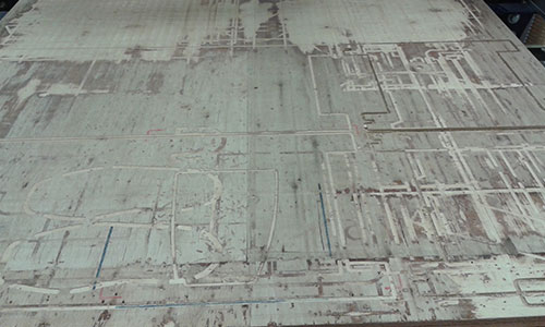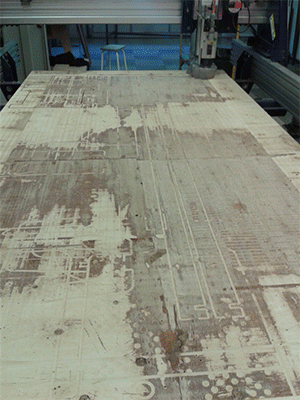 Over the course of many jobs the shopbots sacurifical bed gets worn down. So every now and then we rotate and resurface it. This spreads the wear around evenly and increase its longervity. Flattening the entire bed with a one of our standard cutters would take a very long time so instead we use the re-surfacing bit which can clear 31mm of material each pass.