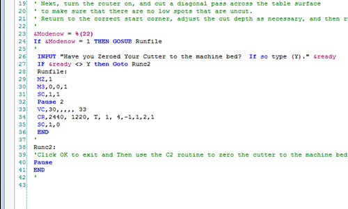 The shopbot can generate the toolpath for resurfacing onces its feed the bed size. The script outputs some g-code that looks like this. Interestingly it doesn’t move the bit to a safe height above the work surface before spinning up.