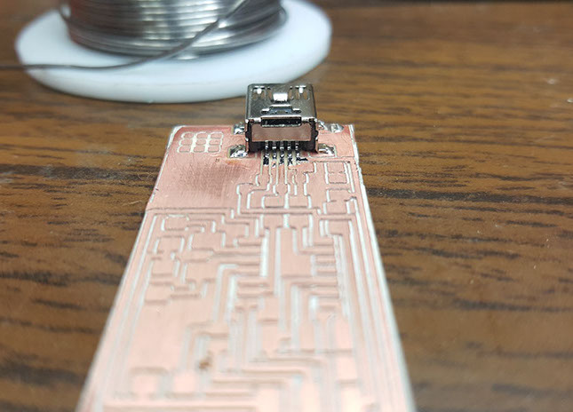Now that i had my design it was time to get producing. Normally I'm quite fond of using etching as I feels it leaves a better finish, however it's due to it being a small circuit i decided to use our CNC milling machine for faster results. For the mill itself I used the FaB Modules. To do the paths I added a 1/64 V tool, for the parameters i only did 2 offsets because I don't quite like the finished product of many offsets and I'm quite sure of my soldering skills. As for the speed I used the defaults it had. For the cutout I used 1/32 mill, and kept all defaults except for the depth of cut which i made slightly bigger.