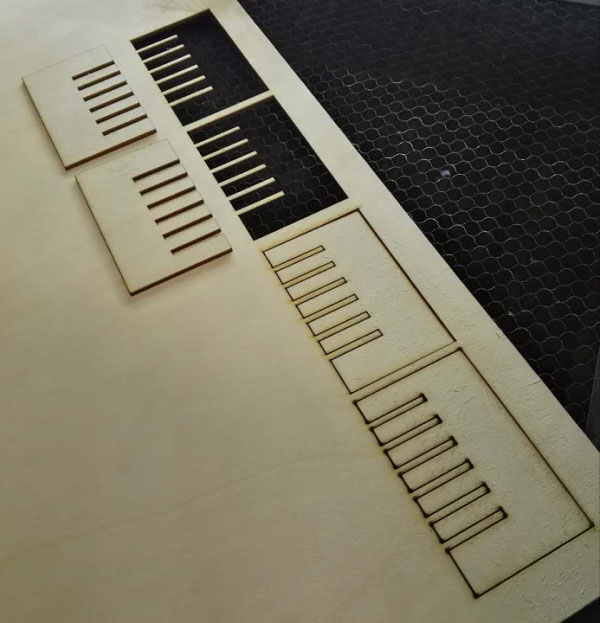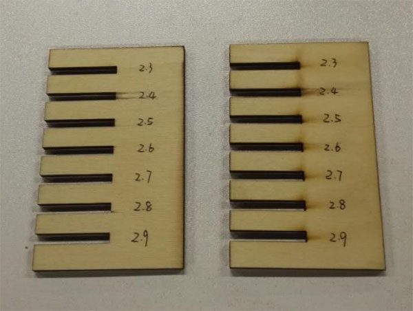 This assignment, we decide to use polywood as the raw material. Gauge testing is necessary to make sure the gap of each teeth. If the joints are loose, the model can't stand, if the joints are too tight, the model can't be joined together either.