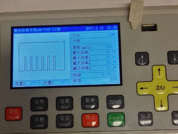 After checking, open the DXF file in the Laser Control software, set the cutter speed to 20,and the rate of power to 70. the export as a cutting file to USB disk.