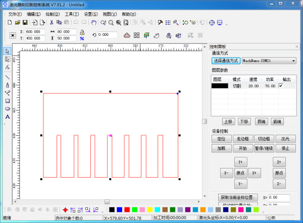 After checking, open the DXF file in the Laser Control software, set the cutter speed to 20,and the rate of power to 70. then save the export for the cutting file to USB disk.