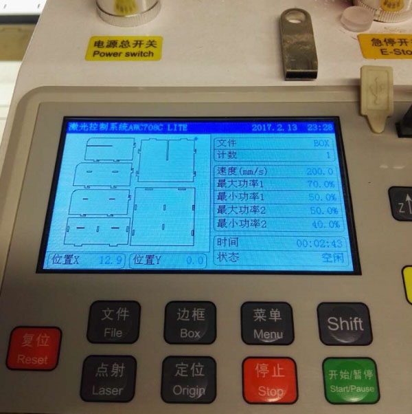 Plug the USB disk to the Laser Cutter. Setting the Origin point to the right position, click the Box button to test before cutting operation.