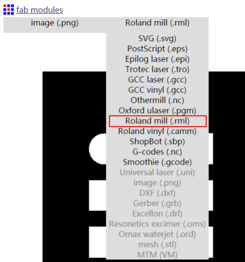 I used the online FabModules to convert the png file to rml milling file. Open the fabmodules.org in the explorer. Click the input format and choose the png file format, then open the trace file. Click the output format, choose the Roland mill(.rml).