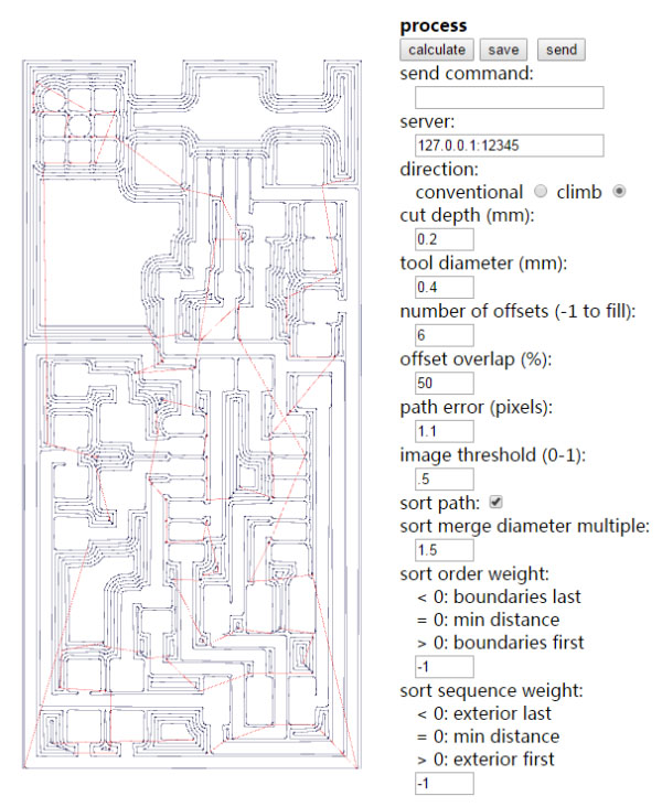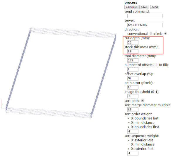Perform the same operation, open the outline png file. Choose the 1/32 endmill, to calculate and save the rml milling file. During operation, set the cut depth parameter.