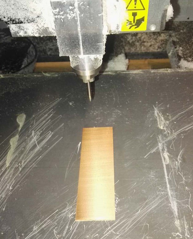 Stick the PCB to the top of the sacrificial board with 3M tape. Place the endmill(1/64) into the hole,then tighten it.