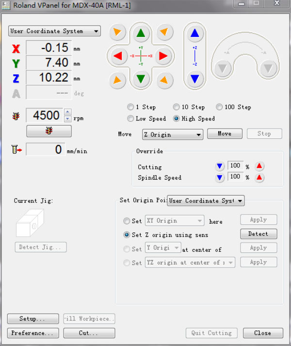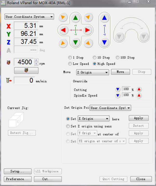 Open the Vpanel software. Click the arrow button to move the miller to the right position, then set the origin position of X and Y axis and click apply button.
