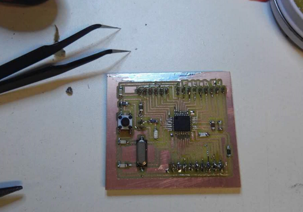 Soldering 328P chips require a lot of skill, and Jing Wang of our Makebator helps me a lot. I make three pieces, two pieces work, the first piece can not work because the pin Hole is to bigger and the copper wire is breaked.