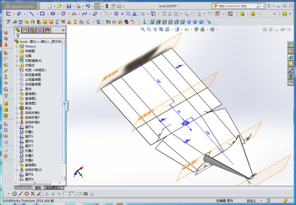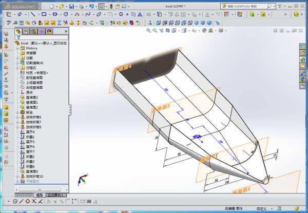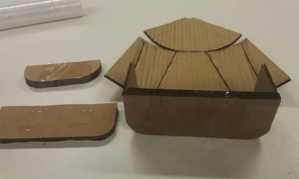 I design the model of the boat by Solidworks, then loft the model int dxf file, cut the cardboard by laser cutting machine, then molded it and finally molded it through epoxy and glass cloth.