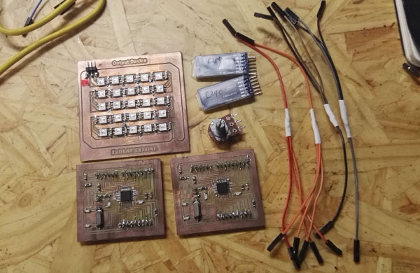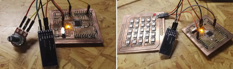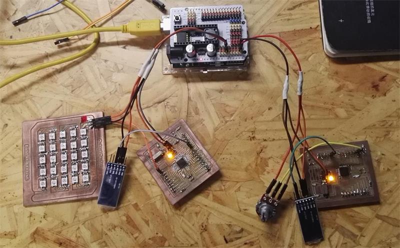 This project, there are two pieces of 328p board, each board connecting one Bluetooth module, one board is connected with a potentiometer, another piece of board is connected with LED matrix. Rotating potentiometer, the birghtness of the next board changes. This reason is that the data is transfered by the bluetooth module.
