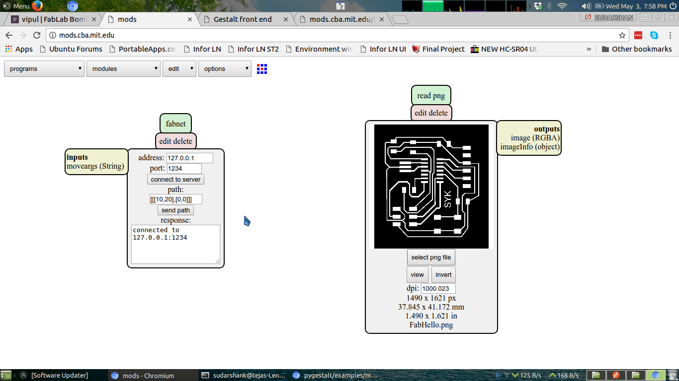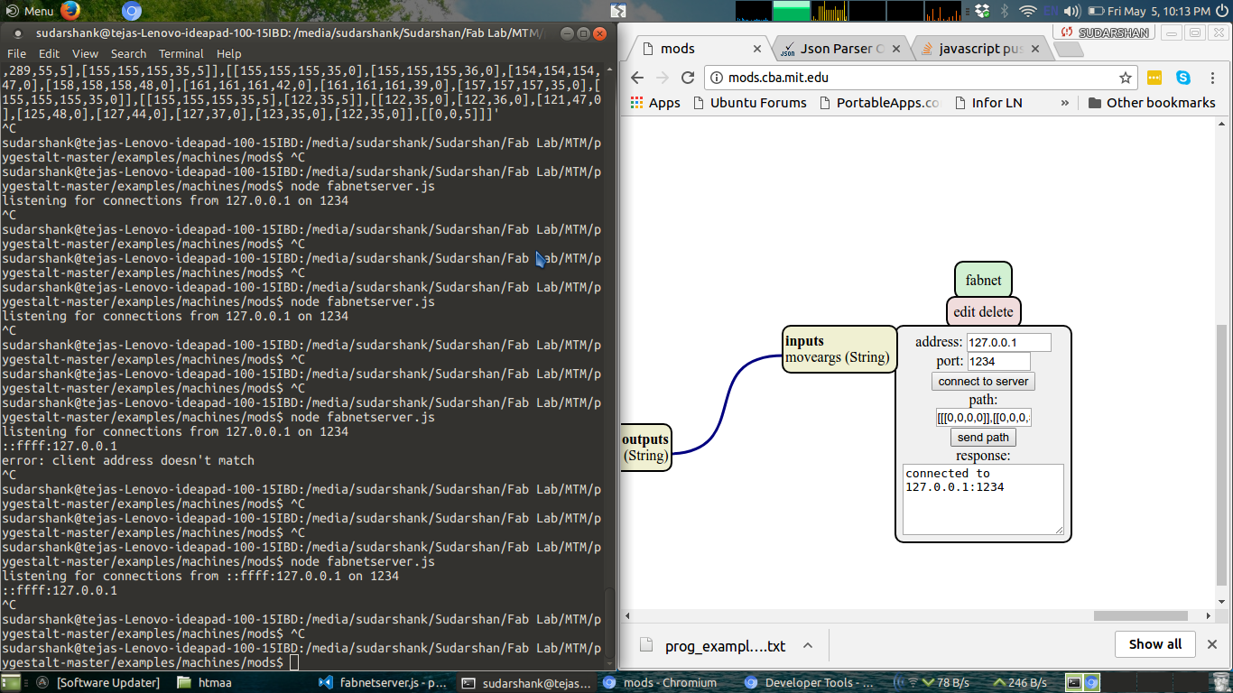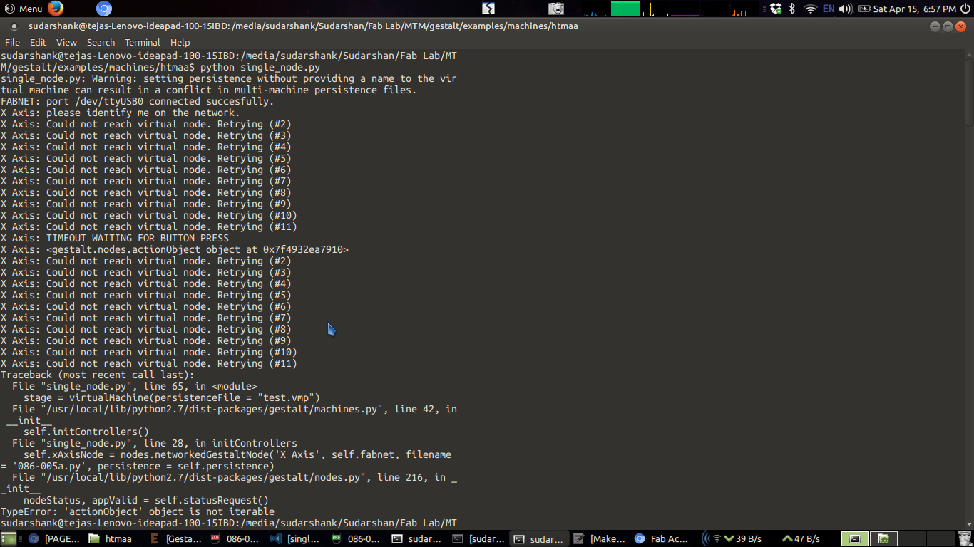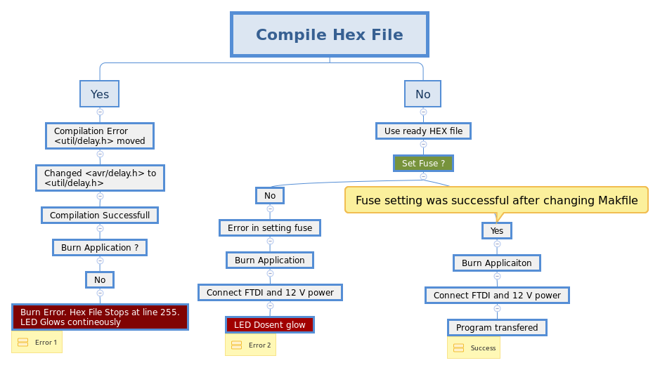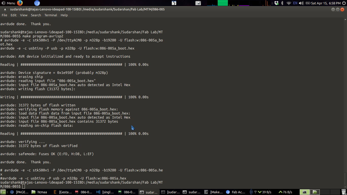 sudarshank@tejas-Lenovo-ideapad-100-15IBD:/media/sudarshank/Sudarshan/Fab Lab/MTM/086-005-master$ make program-arduino-fuses avrdude -c stk500v1 -P /dev/ttyACM0 -u -p m328p -b19200 -U lfuse:w:0xff:m -U hfuse:w:0xd9:m -U efuse:w:0xfd:m avrdude: AVR device initialized and ready to accept instructions Reading | ################################################## | 100% 0.02s avrdude: Device signature = 0x1e950f (probably m328p) avrdude: reading input file "0xff" avrdude: writing lfuse (1 bytes): Writing | ################################################## | 100% 0.01s avrdude: 1 bytes of lfuse written avrdude: verifying lfuse memory against 0xff: avrdude: load data lfuse data from input file 0xff: avrdude: input file 0xff contains 1 bytes avrdude: reading on-chip lfuse data: Reading | ################################################## | 100% 0.01s avrdude: verifying ... avrdude: 1 bytes of lfuse verified avrdude: reading input file "0xd9" avrdude: writing hfuse (1 bytes): Writing | ################################################## | 100% 0.02s avrdude: 1 bytes of hfuse written avrdude: verifying hfuse memory against 0xd9: avrdude: load data hfuse data from input file 0xd9: avrdude: input file 0xd9 contains 1 bytes avrdude: reading on-chip hfuse data: Reading | ################################################## | 100% 0.01s avrdude: verifying ... avrdude: 1 bytes of hfuse verified avrdude: reading input file "0xfd" avrdude: writing efuse (1 bytes): Writing | ################################################## | 100% 0.01s avrdude: 1 bytes of efuse written avrdude: verifying efuse memory against 0xfd: avrdude: load data efuse data from input file 0xfd: avrdude: input file 0xfd contains 1 bytes avrdude: reading on-chip efuse data: Reading | ################################################## | 100% 0.01s avrdude: verifying ... avrdude: 1 bytes of efuse verified avrdude done. Thank you. sudarshank@tejas-Lenovo-ideapad-100-15IBD:/media/sudarshank/Sudarshan/Fab Lab/MTM/086-005-master$ make program-arduino avrdude -e -c stk500v1 -P /dev/ttyACM0 -p m328p -b19200 -U flash:w:086-005a.hex avrdude: AVR device initialized and ready to accept instructions Reading | ################################################## | 100% 0.02s avrdude: Device signature = 0x1e950f (probably m328p) avrdude: erasing chip avrdude: reading input file "086-005a.hex" avrdude: input file 086-005a.hex auto detected as Intel Hex avrdude: writing flash (3910 bytes): Writing | ################################################## | 100% 4.32s avrdude: 3910 bytes of flash written avrdude: verifying flash memory against 086-005a.hex: avrdude: load data flash data from input file 086-005a.hex: avrdude: input file 086-005a.hex auto detected as Intel Hex avrdude: input file 086-005a.hex contains 3910 bytes avrdude: reading on-chip flash data: Reading | ################################################## | 100% 2.42s avrdude: verifying ... avrdude: 3910 bytes of flash verified avrdude: safemode: Fuses OK (E:FD, H:D9, L:FF) avrdude done. Thank you. sudarshank@tejas-Lenovo-ideapad-100-15IBD:/media/sudarshank/Sudarshan/Fab Lab/MTM/086-005-master$
