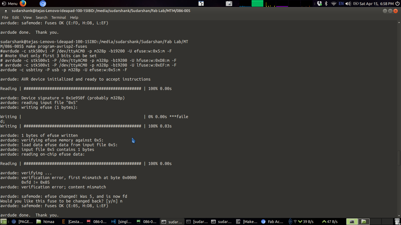 sudarshank@tejas-Lenovo-ideapad-100-15IBD:/media/sudarshank/Sudarshan/Fab Lab/MTM/086-005-master$ make program-avrisp2-fuses
