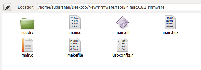 sudarshan@sudarshan-Lenovo-ideapad-100-15IBD:~/Desktop/New/firmware/fabISP_mac.0.8.2_firmware$ make help This Makefile has no default rule. Use one of the following: make hex ....... to build main.hex make program ... to flash fuses and firmware make fuse ...... to flash the fuses make flash ..... to flash the firmware (use this on metaboard) make clean ..... to delete objects and hex file sudarshan@sudarshan-Lenovo-ideapad-100-15IBD:~/Desktop/New/firmware/fabISP_mac.0.8.2_firmware$