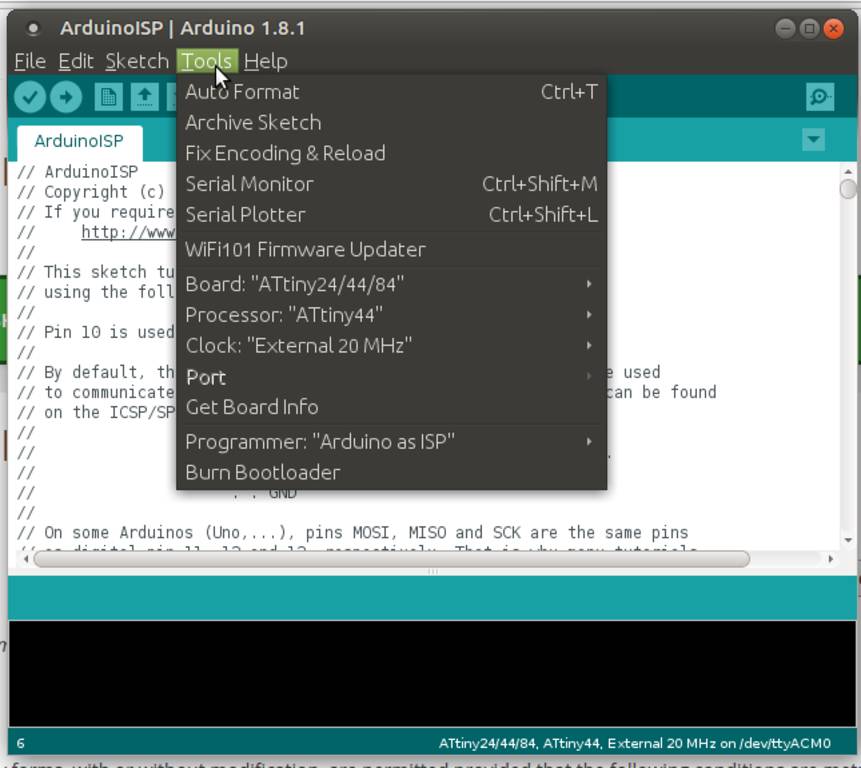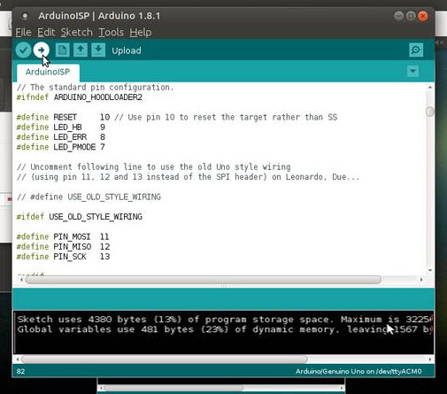 Select File -> Examples -> ArduinoISP -> ArduinoISP