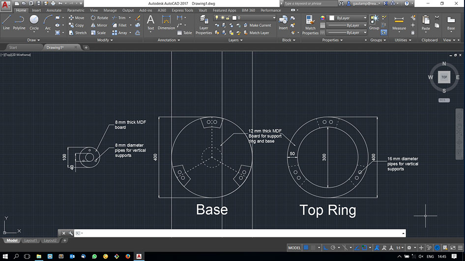 Before creating a 3D model of the printer, it is necessary to draft the probable idea of its form to understand the dimensions for the components that are to be used. So, my first step was to draft my idea for the 'Delta clay printer' using AUTOCAD to understand as to what components I shall be using to construct the same.