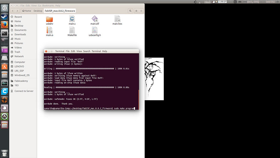 I connected the board to the AVR and to the linux pc to program the FabISP. Next I followed the steps mentioned in the link above to program the FabISP.