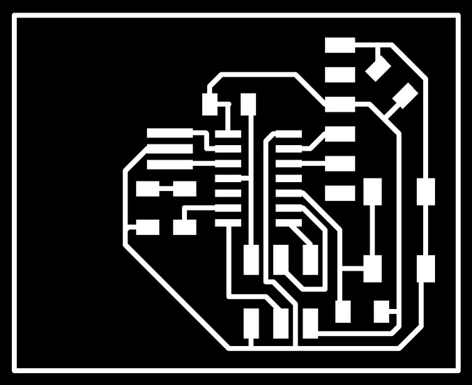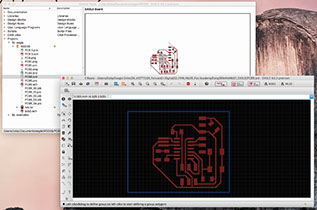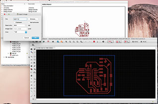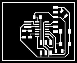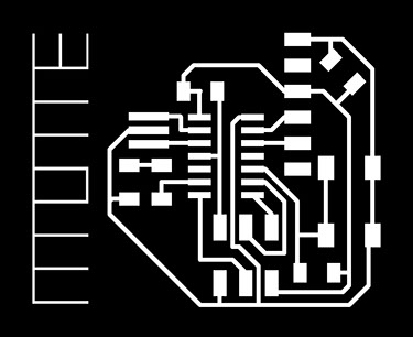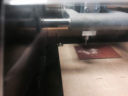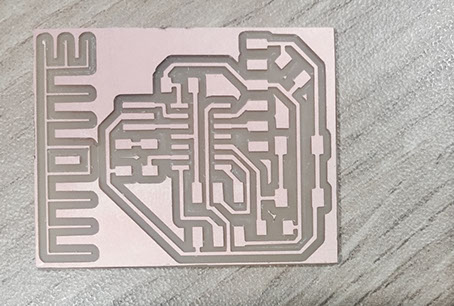 When the layout scheme and board were ready, I proceeded to export the .png black and white image for the MODELA MDX-20. In fact, if you know the components and dimesions well, it is possible to design the PCB with simple drawing software like paint, or with a slightly more elaborate one like Photoshop. After generating the .png image, I used photoshop to add my personal logo and to prepare both images, traces and interior. Then I mill the board in the MODELA. But I should have taken into account the width of the logo, because the lines were very thin.