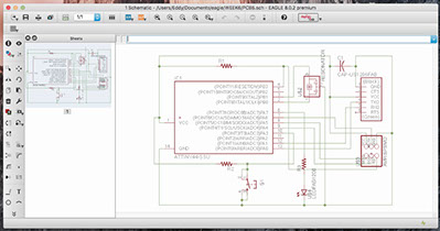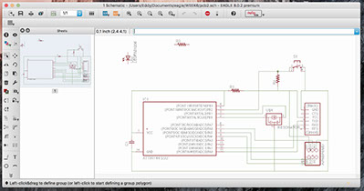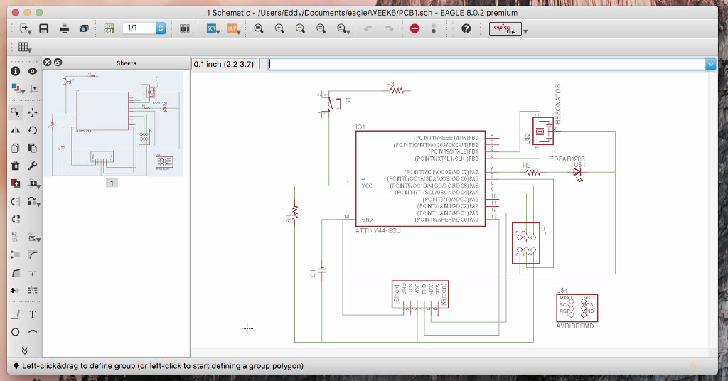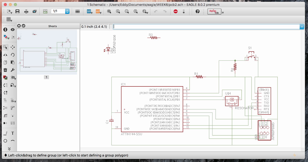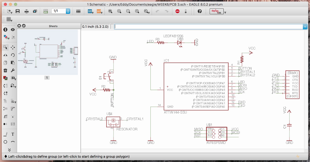 In order to redraw the echo hello-world board, i used Eagle from Autodesk. I redraw the board schematic adding a button and LED. Until I finally understand the program and the board I drew up to four schematics. A schematic is a part of an Eagle project (electronic project), is the first part of the design. There with the add command, you begin to set the components that should have your PCB, and with the net command you interconect them. I drew up four schematics, because I didn't find the right order of conections. When you have your schematic ready, you have to select the Switch to board icon, which leads to a presentation where to properly design the board. Here you specify the width of the tracks and the size of the pads. I used a 0.025 inch grid and 0.016 inch width for the tracks.