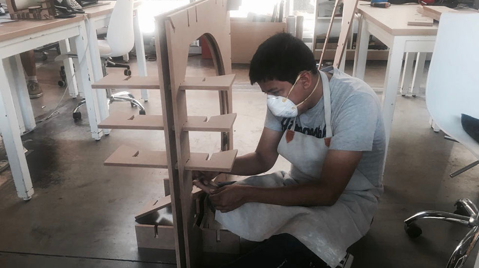 This second scale model was successful, from there I had to adjust the prototype to its mechanisms, considering passes for the cables, the place for the motors, the location of the rails, the pulleys, the stepper motors, the supports for the plate, etc. Then we have to cut the pieces on the shopbot and assemble them. The final material was MDF (12mm).