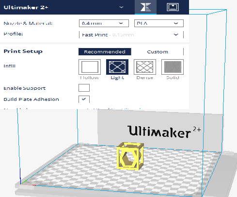 With reference to How to use Cura Software. I then proceed to open the exported stl file in Cura, an auto slicing process will be done which basically converts the model into a series of thin layers and produces a G-code file containing instructions to be printed during the 3D printing process. I will be using the Fast print - 0.15mm for my model as other option will take a longer time to print the object. I export it to a SD card and send to printer to print. The filament use is PLA.