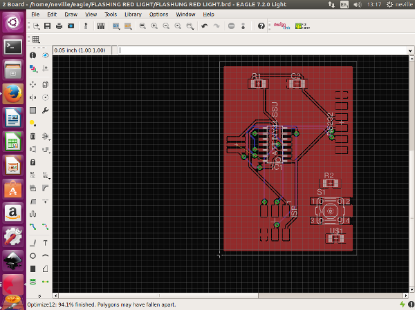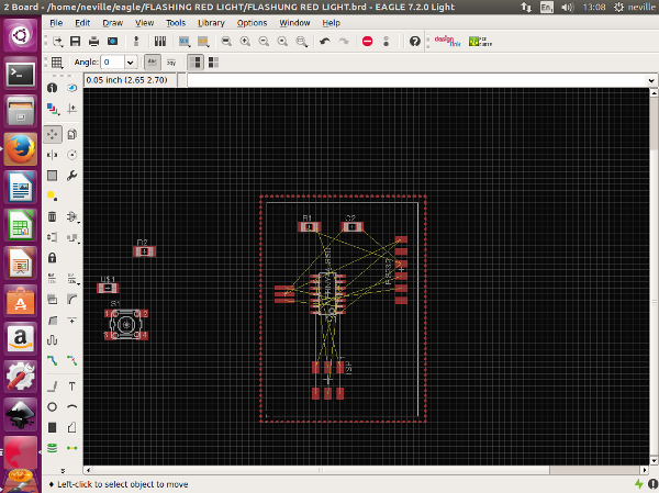 Now that i was finished with my schematic design, i switched to the board. This was a bit of a shock. made it look so much more complicated with so many lines all crossing each other. I brought in the components into the board area from outside the board area as you cannot work with the components outside the board area. I focused first on the board but did not want to bring in the switch and the LED just Now. i started to arrange the Board the way i wanted it to look like. because there are so many examples available, i was aware of what my board should look like.The software allows you to use an automatic feature. This uses the information avilable and shows you the best way the board should be done. this is just a guide and once it does that, it helps you to complete the design to what you want it to be.