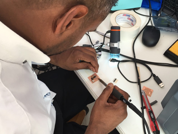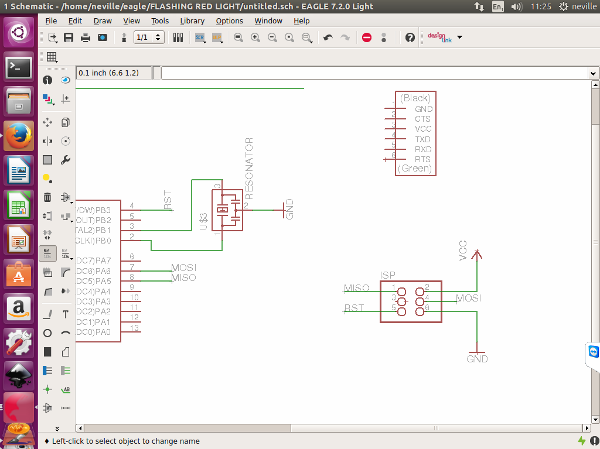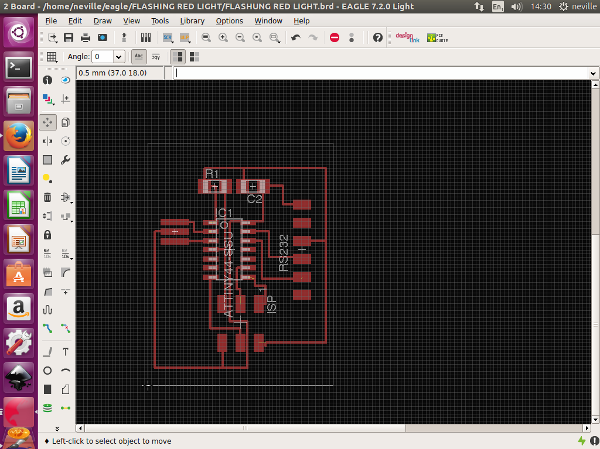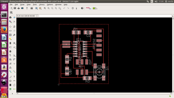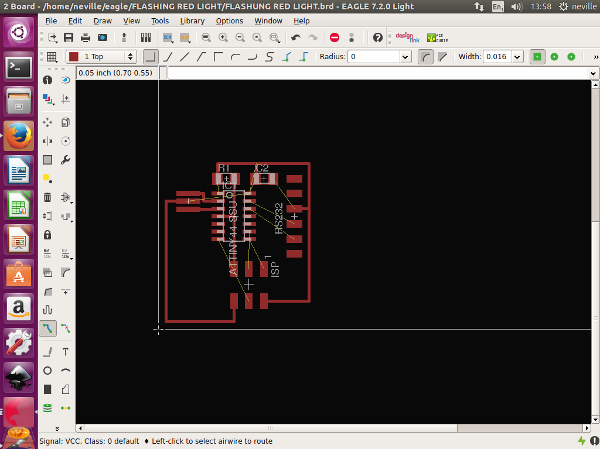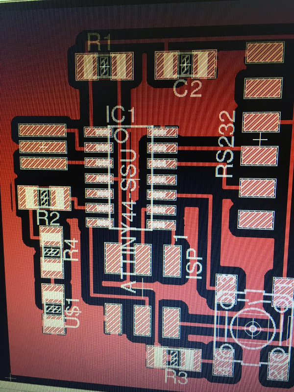 Now for the components to be soldered onto the board This is when i encountered lots of problems, I should have checked before i started if i have all the correct components . one of the components needed was a 200 ohm resistor. i did not have a 200 ohm resistor. but i did have 100 ohm resisters , which meant i could combine two 100 ohm resistors in series and create a 200 ohm resistance. But my Board was already milled only allowing for one 200 ohm resistor. I had to go back, to eagle and redesign. It was quick as i folled the same steps just added another resistor.this did not take me much time as i had learnt the software very quickly , i quickly edited the schematic and the board and was ready to cut the board.