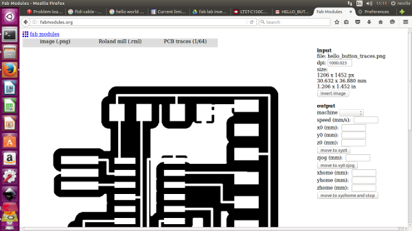 After creating the PNG file i went into fabmodules to print my board. I went to output Format, Image and brough in the PNG File then the output Format, selcted the Roland mill. then the PCB traces (1/64) then again on the right hand side i selected my machine which is the MDX 20 the one thing also for the machine to move , i had to add ./ infront on the send command line as shown in the pictures. I then claculeted the traces and it provides a view of how the traces would be milled.then i went to get my machine(MDX20) ready