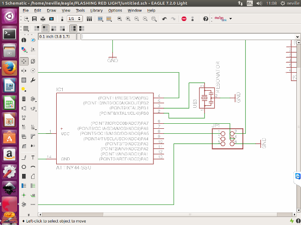 After bringing in all my components , i started to create my schematic design. I tried to link my components. It was then staring to seem like I was creating a complicated design and yet it was just a simple design. But this was because I was tring to link all the components with direct lines on the schematic and my lines started to cross each other or i needed to create a big loop for the line to join components so that they dont cross eaxh other.