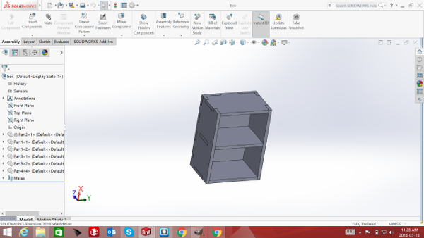 Using solid works and choosing the asembly function i have assembled all the parts to make sure that it would work perfectly so that i would not have to waste materail by just cutting without knowing for sure that it would work.This is a brialiant feature as if your design is not right you would be able to see and you can correct the design immediately.