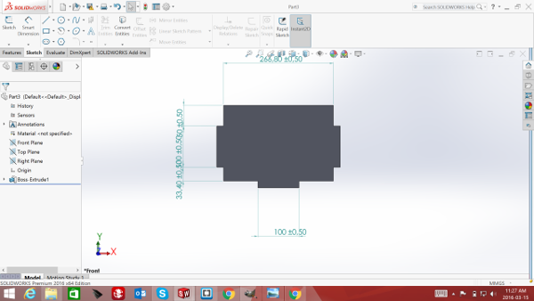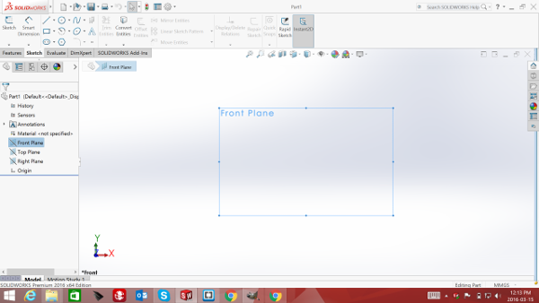 Once the file is open we select front Plain as we need to select a view in order to start our drawing, Then select sketch , this enables us to use the drawing tools