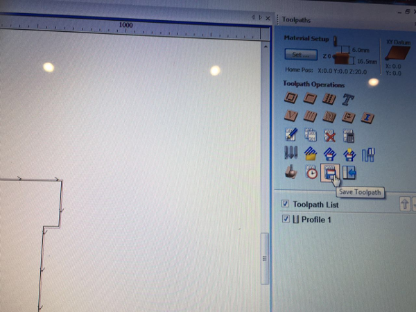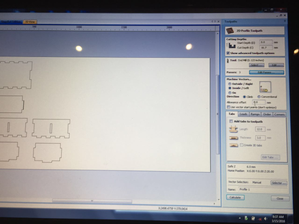 Tool path created when cutting on the outside. then the file is saved and ready for cutting. The i opened the Shopbot Software for cutting