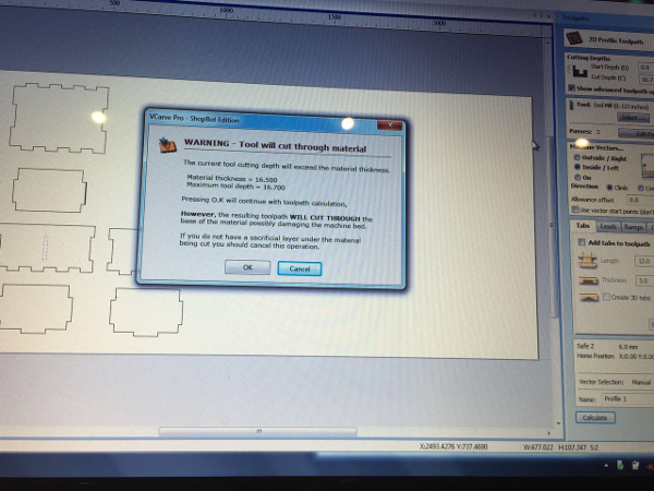 Becuase I have choosen to cut right through the materail, I recieve a reminder that i am going to cut through the wood sheet.Then it creates the tool path.