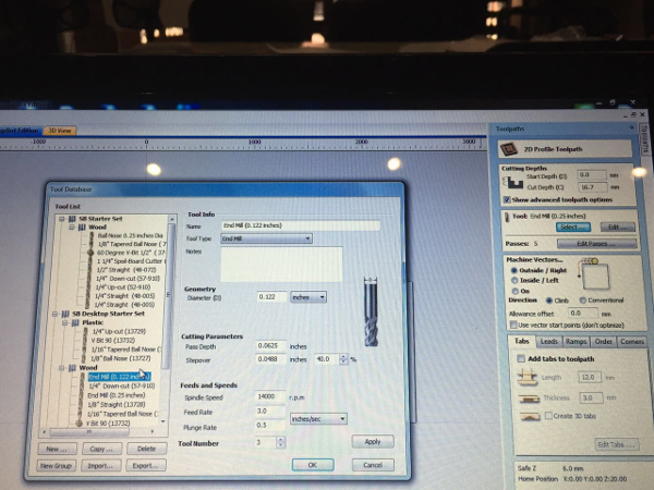 selecting the correct bit from the list. once that is done and you have chosen the tool and the number of passes and whether you want to cut on the inside or outside, and how deep you want to go,then you would say calculate