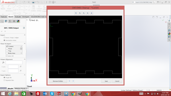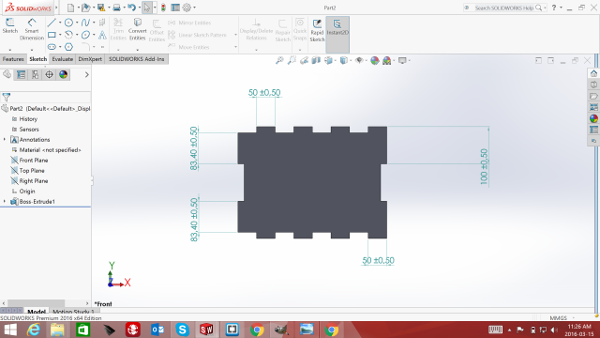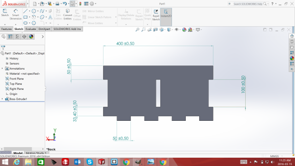 We start by drawing the Back of the Mini Book shelf and calculate the number of Snap Fits we require and design accordingly. once we have designed accordingly we the use Features Button and do an Extrusion using the thickness of the materail.