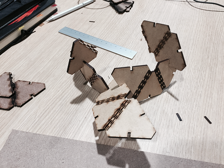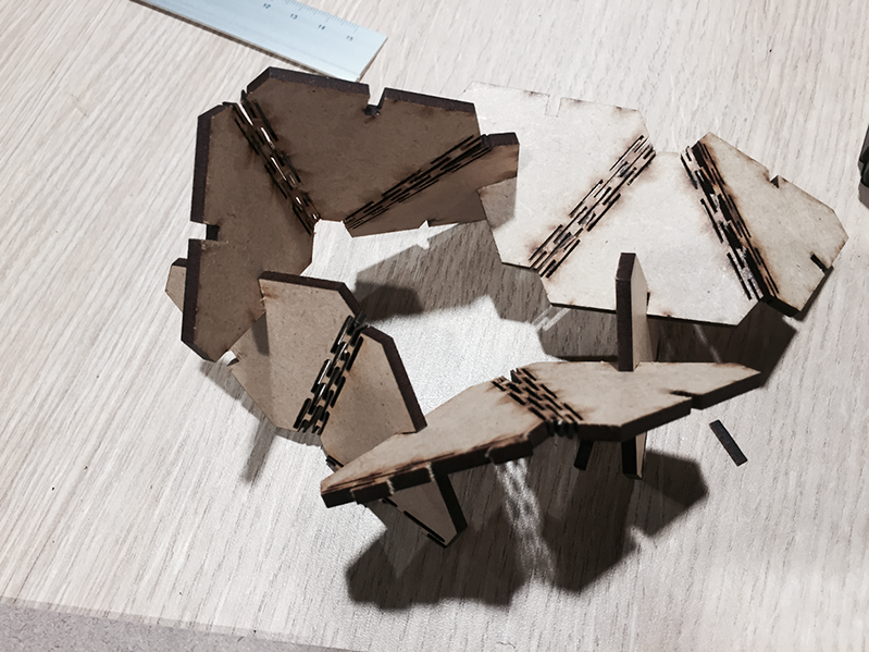 The settings for the lasercutter were: for raster 100% speed and 100% power, for vector 16% speed, 100% power and 500Hz frequency. I had to slightly modify the cutting parameters we defined in the group task due to the complexity of the piece. The articulation bands needed less speed and more power to be cut in a single pass.