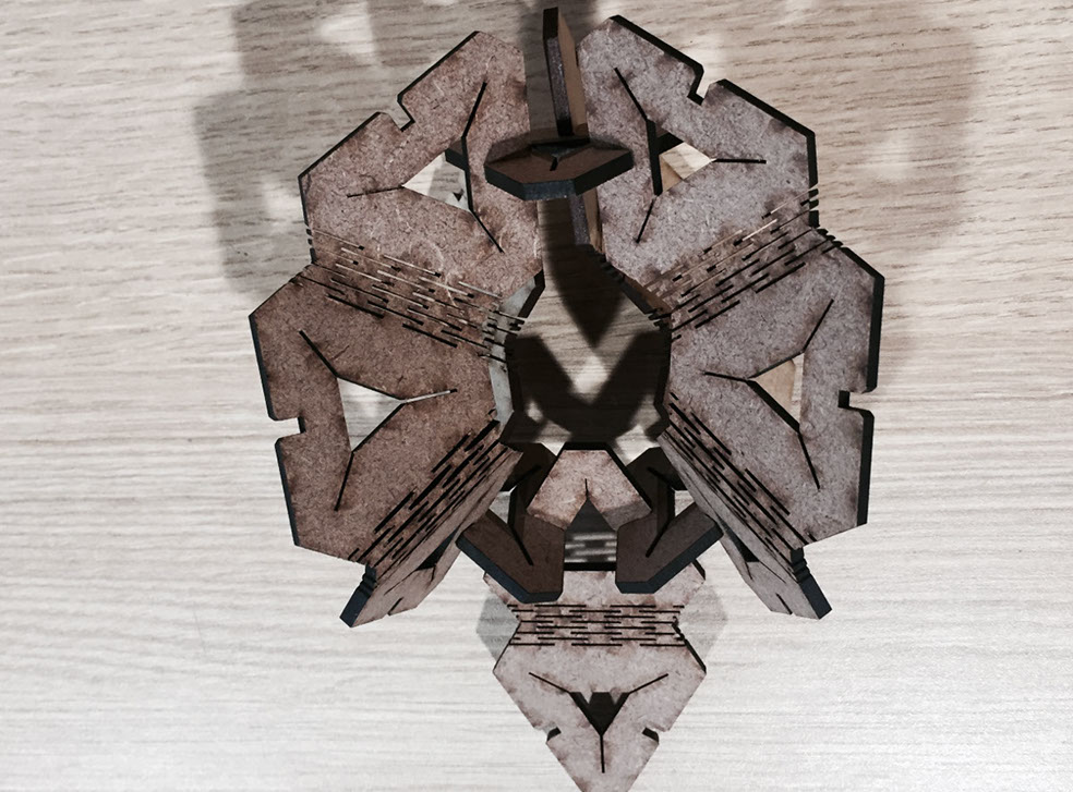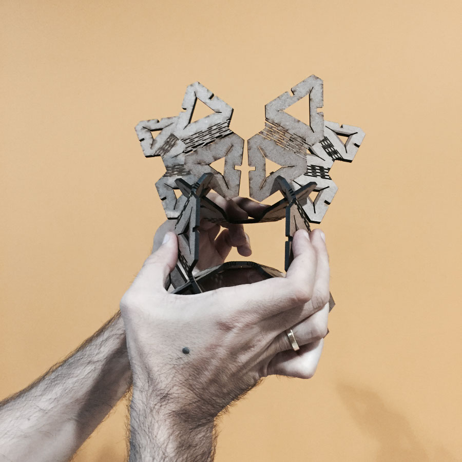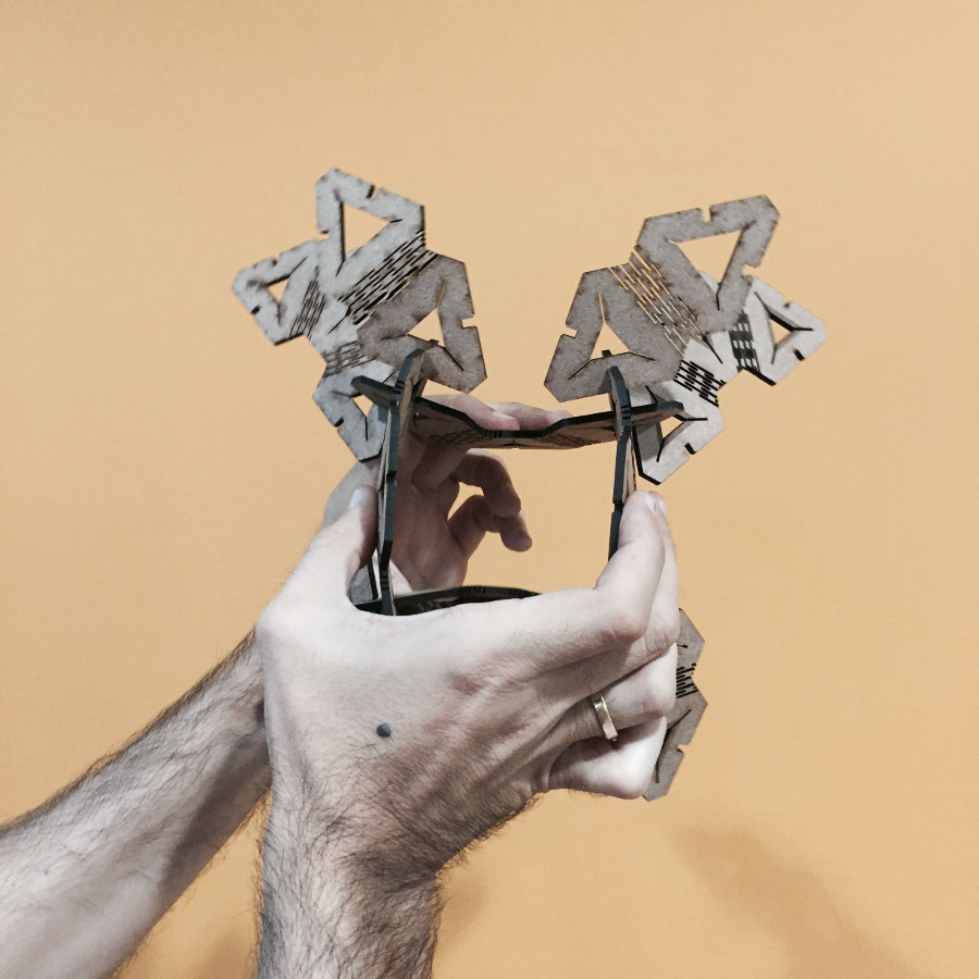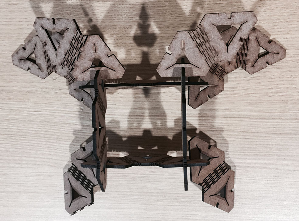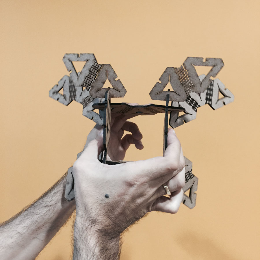 With this assignment my idea was to make a single modular piece for the whole construction kit. First I thought in a simple triangle but I wanted it to be more versatile, not just 30º, 60º and 120º. I also wanted an orthogonal possibility and an even more flexible piece, so I add a kerv articulation.