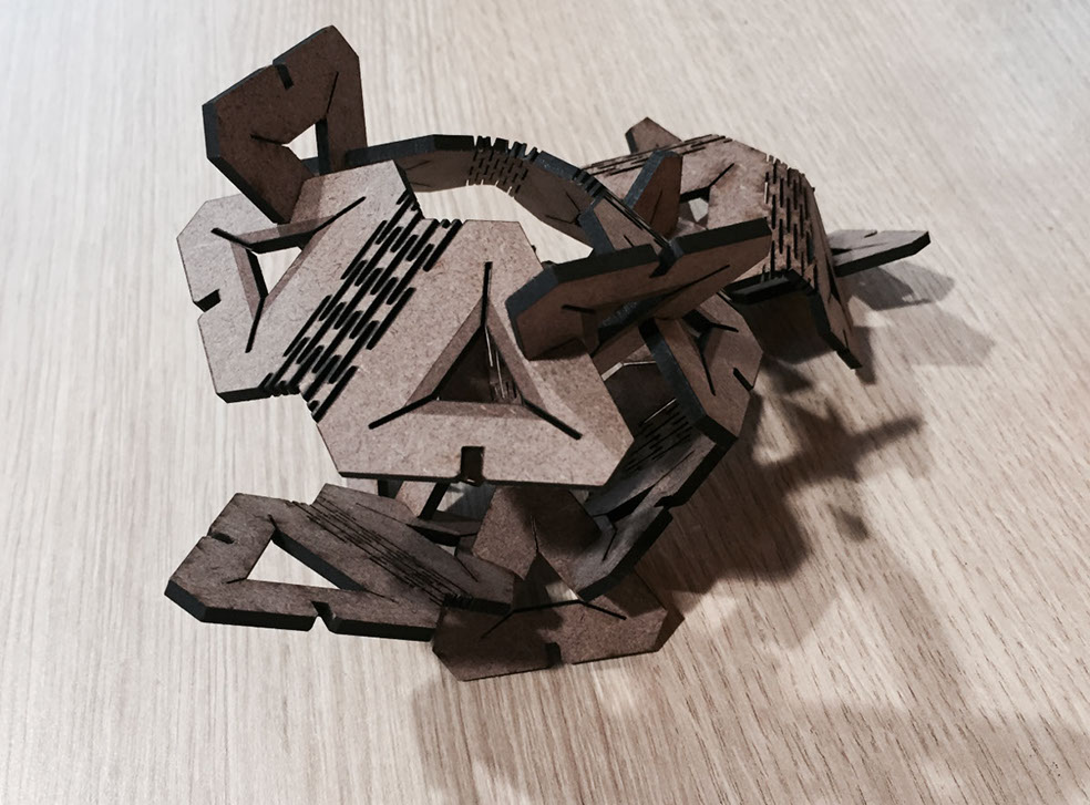 Finally I tried a piece with eight stripes, I realized that the more stripes the piece had, the more flexible it became and the more resistance it lost. So I looked for an amount that would balance flexibility and endurance. It worked much better, so I added two modular pieces and more detail.