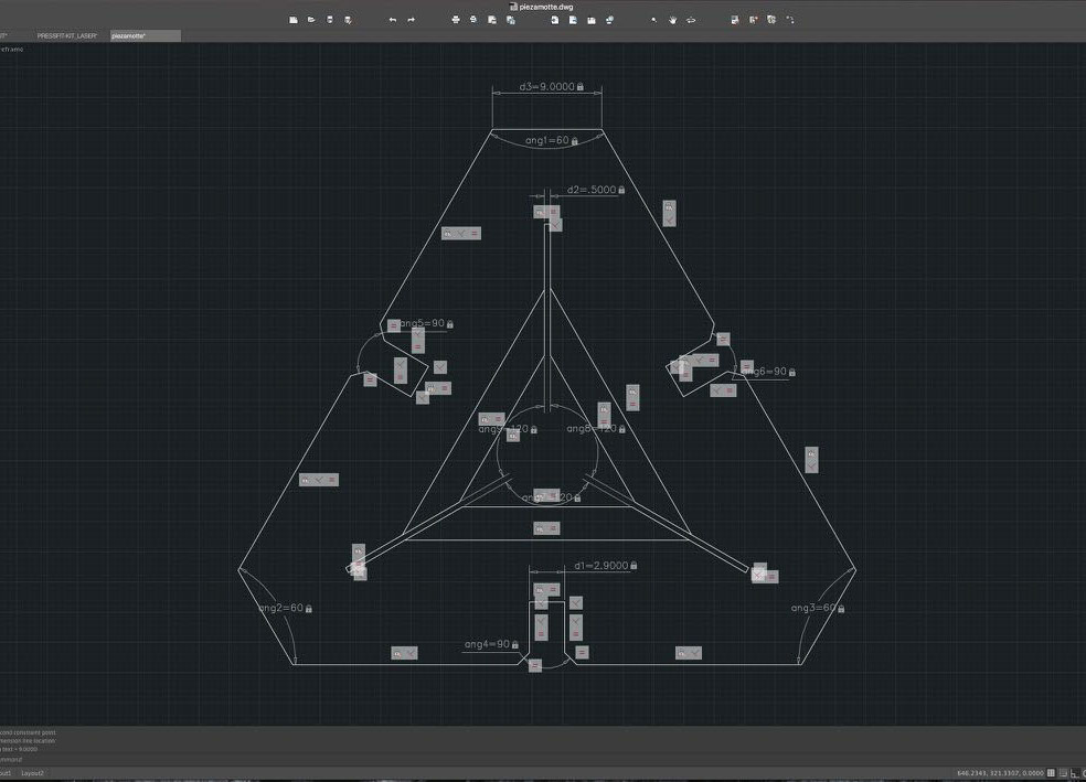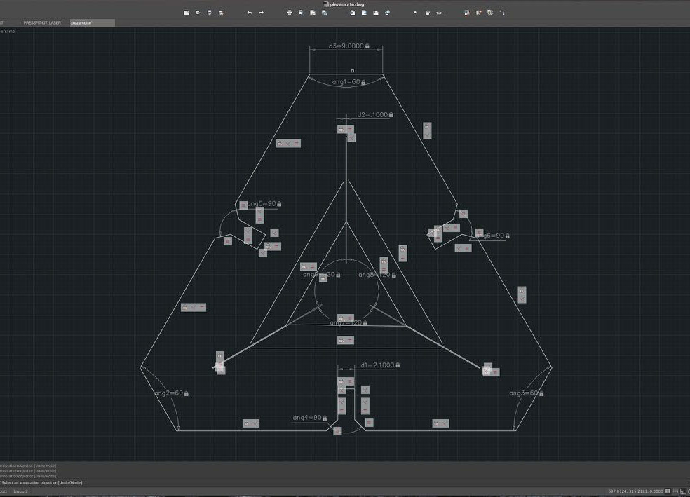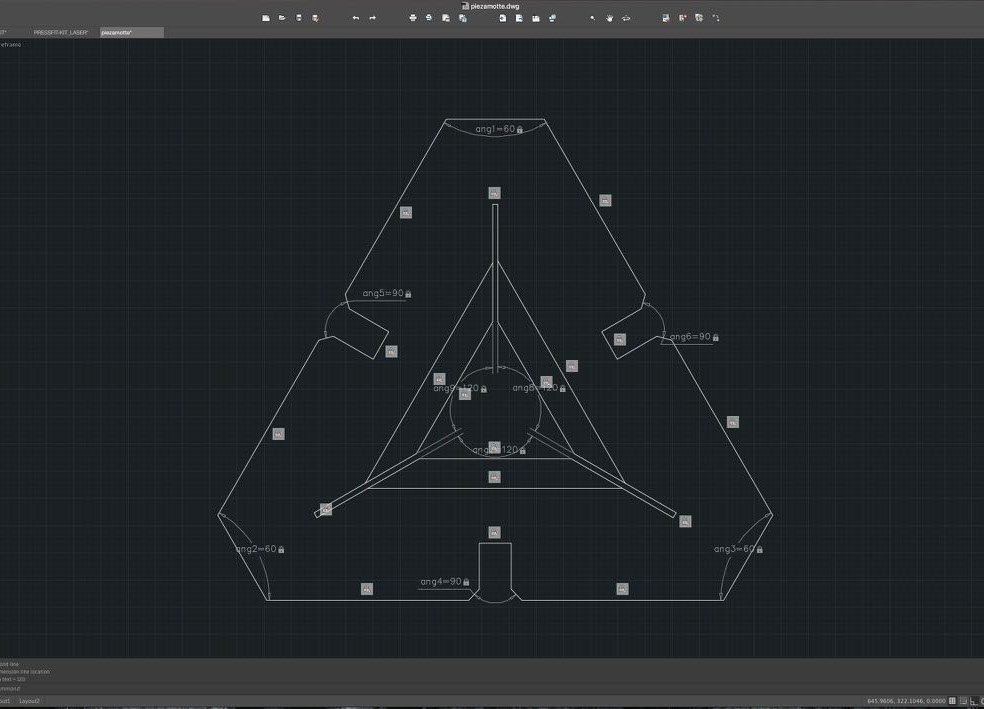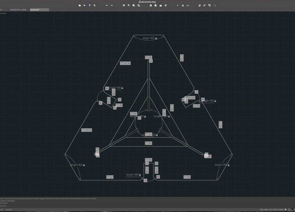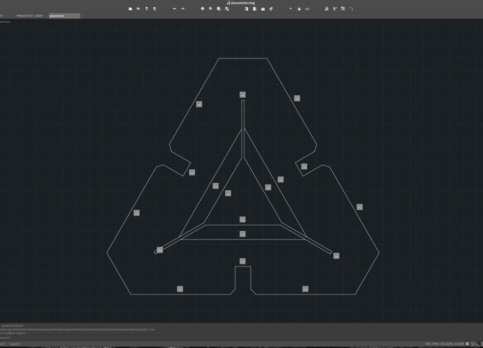 For the final piece, I tried the parametric design again, only this time I defined a parameter order. First the points that will not change position (geometrical constrains fix), then the angles (dimensional constrains angular), the the lines (geometrical constrains equal and perpendicular) and finally the distances that I might want to change (dimensional constrains linear). The idea was that if you had to modify the piece for another material, you could change the joints measures quickly and practically.