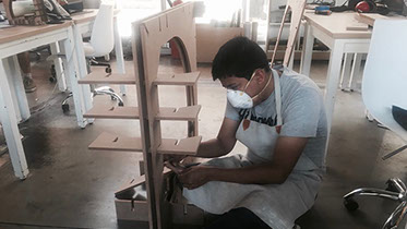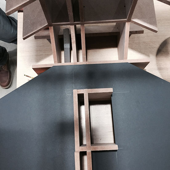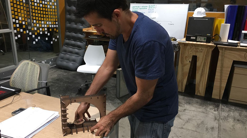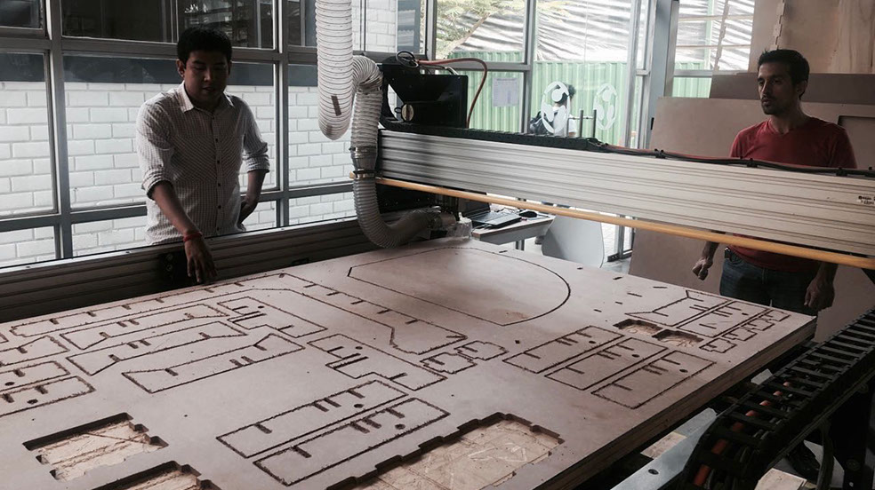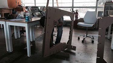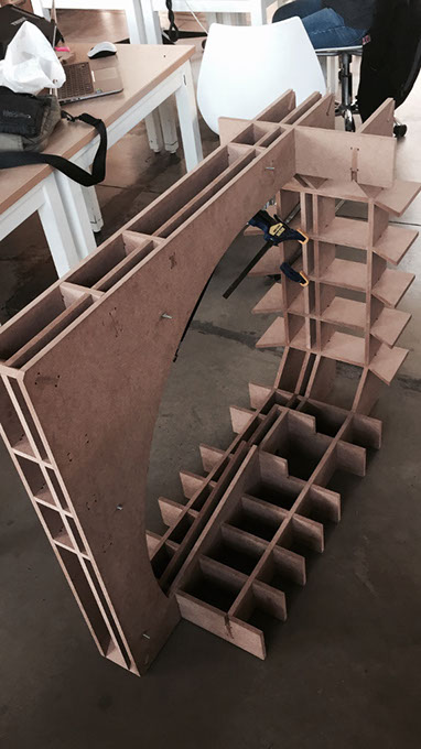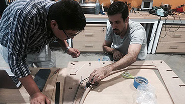 This second scale model was successful, from there I had to adjust the prototype to its mechanisms, considering passes for the cables, the place for the motors, the location of the rails, the pulleys, the stepper motors, the supports for the plate, etc. Then we have to cut the pieces on the shopbot and assemble them. The final material was MDF (12mm).