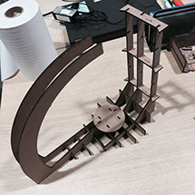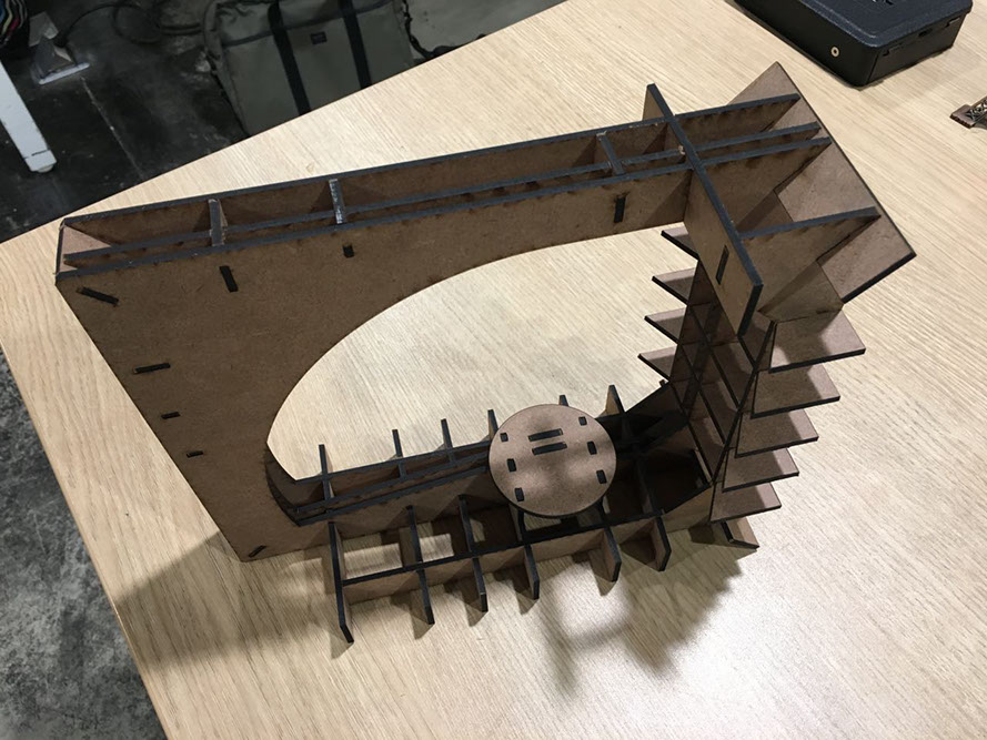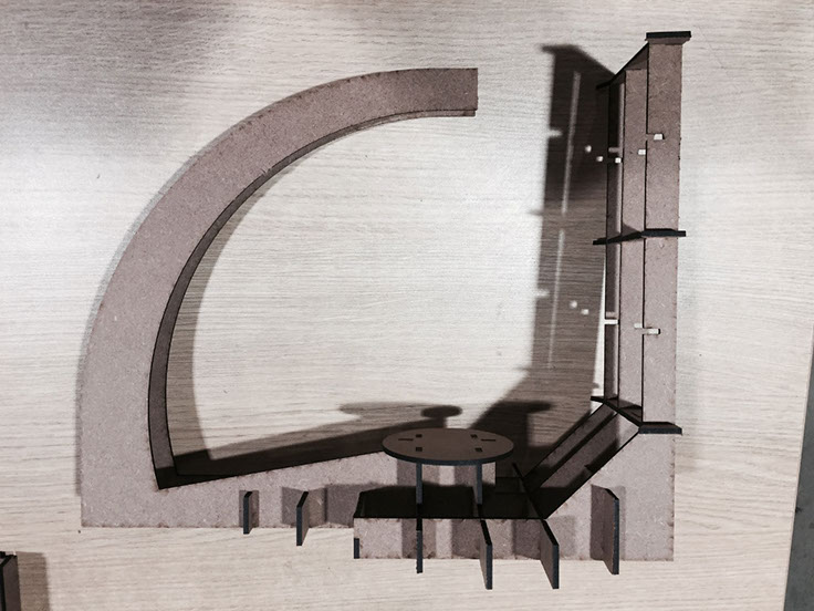 For the first idea, I made a scale model with MDF (3mm) using the lasercutter, but it turned out to be a very weak structure for the desired movement.